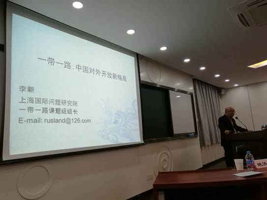 下午主要分为三部分进行,首先是上海国际问题研究院俄罗斯中心主任李新研究员开展了“‘一带一路’相关主题”的讲座,李新研究员向大家介绍“一带一路”重大构想的国际背景,表明中国经济进入“新常态”,需要通过开拓销售市场,调整经济结构转移产能,寻求更多原料能源三大措施来解决产能过剩的问题。此外,还向大家介绍在9月在哈萨克斯坦提出的共同建设“丝绸之路经济带”的具体内容。李新研究员表示“‘一带一路’构成了中国全方位对外开放的战略新格局,标志着中国开放战略发生了实质性变化。”